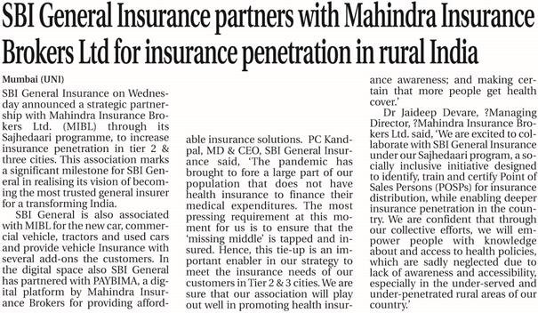 SBI General Insurance partners with Mahindra Insurance Brokers Ltd for insurance penetration in rural India